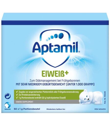 Zur Anpassung des Eiweißgehaltes 0,4-0,9g Aptamil Eiweiß+ pro 100ml Nahrung zugeben, um dem höheren