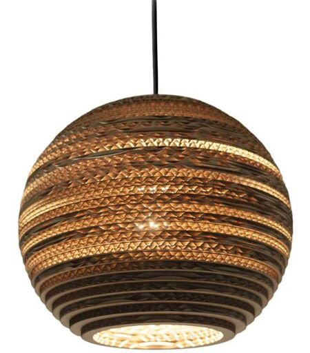 Die elegante graypants Moon Pendelleuchte wird aus recyceltem Karton handgefertigt und ist daher ein absolutes Unikat. Sie besticht durch ihre runde, harmonische Form, eine einzigartige Lichtinszenierung und einer faszinierenden Oberflächenstruktur. Robust und dennoch elegant, die graypants Moon Pendelleuchte besteht aus einer extrem präzisen lasergeschnittenen Kartonkonstruktion, die von Hand mit ungiftigem Klebemittel Schicht für Schicht zusammengefügt und anschließend mit einem umweltfreundlichen, feuerhemmenden Mittel behandelt wird. Durch das innovative Design und unkonventionelle Material, bietet die charakteristische Scraplight Serie von graypants eine warme, intime und funktionale Beleuchtung für jede private und gewerbliche Räumlichkeit. Die formschöne graypants Moon Pendelleuchte strahlt teilweise direktes Licht nach unten und teilweise diffuses Licht durch die Löcher der Wellp... ...