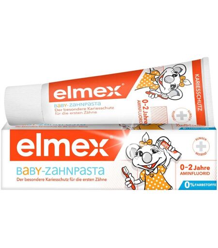 Anwendungsgebiet von Elmex Baby Zahnpasta Kariesschutz für MilchzähneZahncreme für Babys und Kleinkinder mit 1000 ppm FluoridDie Elmex Baby Zahnpasta Kariesschutz für Milchzähne wurde speziell für die empfindlichen Bedürfnisse von Babys und Kleinkindern entwickelt. Sie ist besonders sanft zum Zahnfleisch und enthält Neo-Aminex™, eine innovative Kombination aus Amin- und Fluorid-Technologie, die einen wirksamen Schutz vor Karies bietet:Es bildet sich eine Schutzschicht aus Calciumfluorid auf der Zahnoberfläche, die den Zahnschmelz stärkt.Ihre Zähne werden widerstandsfähiger gegen den durch Karies verursachten Mineralverlust.Zudem unterstützt die Zahnpasta die Rückführung der durch Karies herausgelösten Mineralien in den Zahnschmelz.Wirkstoffe / Inhaltsstoffe / ZutatenInhaltsstoffe von Elmex Baby Zahnpasta Kariesschutz für Milchzähne: Zahnpasta mit FluoridEnthält: Natriumfluorid (1000 ppm F)Ingredients: Aqua, Sorbitol, Hydrated Silica, Hydroxyethylcellulose, Oleaminopropylamineth-3 HCl, Cocamidopropyl Betaine, Aroma, Sodium Fluoride, Saccharin.GegenanzeigenBei bekannter Überempfindlichkeit gegenüber einem der oben genannten Inhaltsstoffe sollte das Produkt nicht verwendet werden. DosierungAnwendungsempfehlung von Elmex Baby Zahnpasta Kariesschutz für Milchzähne: