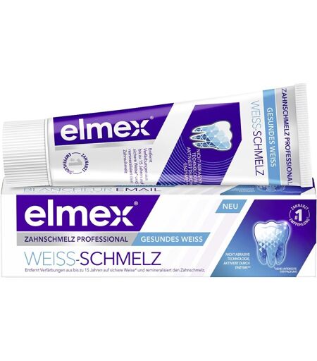 Elmex Whitening Zahnpasta Zahnschmelz Professional Weiss-schmelz enthält eine nicht abrasive Whitening-Technologie*, die durch Enzyme aktiviert wird. Die spezielle Formel entfernt oberflächliche und tiefsitzende Verfärbungen aus bis zu 15 Jahren**, indem eine wirkungsvolle Farbkorrektur des Zahnschmelzes durchgeführt wird. Sie eignet zur täglichen Anwendungen und auch für Personen mit schmerzempfindlichen Zähnen.