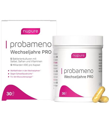 Anwendungsgebiet von Nupure Probameno Wechseljahre PROHormonelle Veränderungen in den Wechseljahren, insbesondere der Rückgang von Östrogen spielen eine wichtige Rolle bei der Zusammensetzung und Funktion der Mikroben in diesen Bereichen, was sich auf deren Zustand auswirkt. Forschungsergebnisse legen nahe, dass die Aufrechterhaltung einer ausgewogenen mikrobiellen Flora helfen kann, Symptome zu lindern und das allgemeine Wohlbefinden während der Wechseljahre zu fördern. Nupure Probameno Wechseljahre PRO enthält fünf klinisch untersuchte Bakterienstämme, die dazu beitragen, das Gleichgewicht der Darm- und Vaginalflora zu unterstützen.Wirkstoffe / Inhaltsstoffe / ZutatenZutaten von Nupure Probameno Wechseljahre PRO: