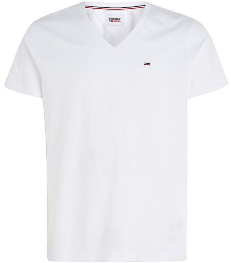 Herren T-Shirt aus Bio-Baumwolljersey V-Ausschnitt Tommy Jeans-Branding Aufgestickte Tommy Jeans Flag auf Brust Schmale Passform Unifarben Farbbezeichnung: White Material: 100 % Bio-Baumwolle ...