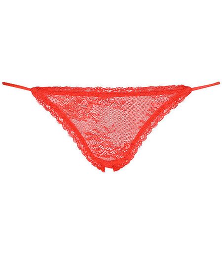 Damen String aus semitransparenter Spitze Hüftbänder aus Satin Baumwoll Einsatz im Schritt Unifarben Farbbezeichnung: Rot Material: 42% Polyamid recycelt, 41% Polyamid, 17% Elasthan ...