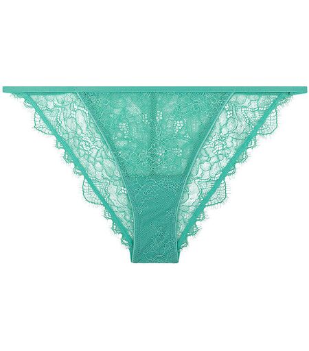 Damen Slip aus glänzendem Stretchgewebe Schmale Seitenbänder Unifarben Rückseite aus floraler, semitransparenter Spitze Farbbezeichnung: Mint Material: 54% Polyamid recycelt, 25% Polyamid, 18% Elasthan recycelt, 3% Elasthan ...