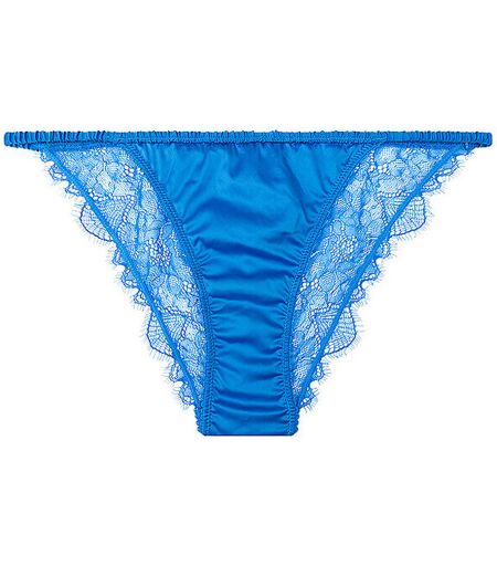 Damen Slip aus glänzendem Stretchgewebe Schmale Seitenbänder Unifarben Rückseite aus floraler, semitransparenter Spitze Farbbezeichnung: Blue Material: 46% Polyamid, 34% Polyamid recycelt, 20% Elasthan ...