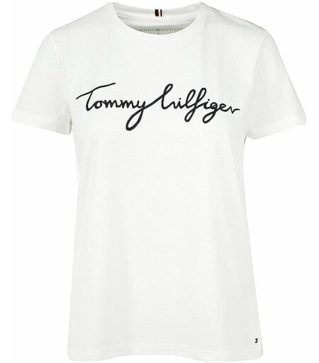 Damen Shirt aus reiner Bio-Baumwolle Tommy Hilfiger-Logo auf der Brust Rundhalsausschnitt Ausschnitt mit aufgesetzten Tommy-Streifen an der Innenseite aufgestickte Tommy Hilfiger Flag am Saum Regular Fit Farbe: White Material: 100 % Bio-Baumwolle ...