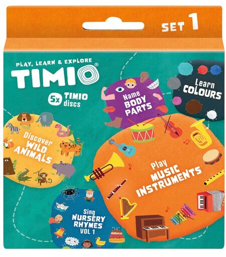Das Audio Disc Set 1 von Timio erweitert den Lernspaß Deines Kindes. Fünf Audio-Discs laden Deinen Mini ein, Kinderreimen zu lauschen oder sich mit wilden Tieren, Musikinstrumenten, Farben oder Körperteilen zu beschäftigen. Audio Disc Set 1 von Timio Reihe: Play, learn & explore Titel: Disc Set 1 (Kinderlieder Vol. 1, Wilde Tiere, Musikinstrumente, Farben, Körperteile) Laufzeit: ca. 30 Minuten technische Details: magnetisch Lieferumfang: 5 Timio-Audio-Discs Sprache: deutsch, englisch, spanisch, französisch, niederländisch, mandarin, italienisch, portugiesisch ab 2 Jahren geeignet Das Audio Disc Set 1 von Timio enthält fünf verschiedene Discs für den separat erhältlichen Timio-Player. Dein Kind kann circa 30 Minuten damit verbringen, Kinderreime zu hören und Wissenswertes über wilde Tiere, Musikinstrumente, Farben oder Körperteile zu erfahren. Da alle Discs magnetisch sind, kann Dein Mini völlig selbstständig zwischen den verschiedenen Themengebieten wechseln und ganz ohne Bildschirm spielerisch lernen. Echte Geräusche und Quizfragen erhöhen den Spaß. Besonders cool: Die Discs können in acht verschiedenen Sprachen abgespielt werden. Zur Auswahl stehen Deutsch, Englisch, Spanisch, Französisch, Niederländisch, Mandarin, Italienisch und Portugiesisch. HinweisDer Timio-Player ist nicht im Lieferumfang enthalten – bitte separat bestellen.Bitte beachten: Eine Rückgabe ist nur mit ungeöffneter Originalverpackung möglich. Wir bitten um Dein Verständnis. ...