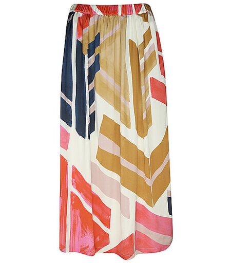 Damen Midirock aus elastischem Gewebe Bequemer Bund Seitliche Eingriffstaschen Grafischer Print Midilänge Farbbezeichnung: Colorfull Blocks Material: 51% Viskose Ecovero 46% Viskose 3% Elasthan ...