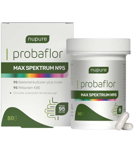 Nupure Probaflor Max Spektrum N95 ist darauf ausgelegt, die natürliche Vielfalt unseres Darms nachzubilden. Mit 95 wissenschaftlich geprüften Bakterienstämmen bietet es das weltweit größte Spektrum an Stämmen.