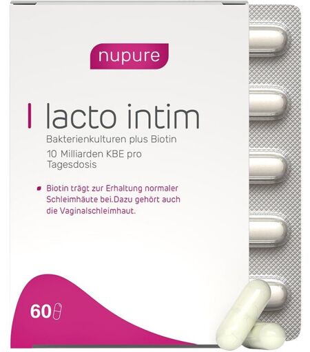 Anwendungsgebiet von Lacto Intim Milchsäurebakterien+biotin Msr.kaps.Lacto Intim Milchsäurebakterien+biotin Msr.kaps. wurde speziell für Frauen entwickelt.Die sogenannte Vaginalflora besteht aus einer Reihe von Bakterien, darunter wichtige Milchsäurebakterien. Sie erhalten den typischen, niedrigen pH-Wert und bilden eine erste Barriere gegen Krankheitserreger.Durch die Einnahme von Antibiotika, aber auch durch Stress, hormonelle Veränderungen oder übertriebene Hygiene kann das Mikrobiom der Vagina aus dem Gleichgewicht geraten. Unerwünschte Bakterien, aber auch Pilze können sich vermehren, und die Anzahl nützlicher Milchsäurebakterien sinkt. Die Folge können Störungen wie Vaginosen oder Pilzinfektionen sein. Begleitet werden diese oft von den typischen Symptomen wie Juckreiz, Brennen, Rötungen und unangenehmer Geruch.Nupure lacto intim enthält die wissenschaftlich erforschten Bakterienstämme Lactobacillus acidophilus La-14 ® und Lactobacillus rhamnosus HN001. Pro Tagesdosis (2 Kapseln) sind 10 Mrd. Bakterienkulturen enthalten. Mit Biotin für die SchleimhautNupure lacto intim enthält zusätzlich Biotin. Biotin trägt zur Erhaltung normaler Schleimhäute bei. Dazu gehört auch die Vaginalschleimhaut.Praktische Einnahme auch unterwegsDank der praktischen Kapselform kann nupure lacto intim einfach eingenommen werden und eignet sich damit als diskreter Begleiter auch perfekt für unterwegs. Auch während der Periode kann nupure lacto intim problemlos angewendet werden.Wirkstoffe / Inhaltsstoffe / ZutatenLacto Intim Milchsäurebakterien+biotin Msr.kaps. enthält:Maisstärke, Lactobacillus acidophilus La-14®, Lacticaseibacillus rhamnosus HN001TM (Milchsäurekulturen), Hydroxypropylmethylcellulose (Kapselhülle), Magnesiumsalze der Speisefettsäuren (Trennmittel), Biotin (Vitamin)GegenanzeigenDarf nicht bei einer bekannten Überempfindlichkeit gegen einen der Bestandteile eingenommen werden.DosierungAnwendungsempfehlung von Lacto Inti ...