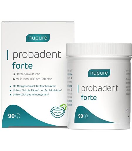 Anwendungsgebiet von Nupure Probadent Forte 3 Bakterienkulturen 5 Mrd KBENupure Probadent Forte 3 Bakterienkulturen 5 Mrd KBE - Für eine ausgewogene MundfloraNupure probadent forte von AixSwiss B.V. bietet eine praktische Lösung, um die Mundpflege täglich zu unterstützen. Mit einer Kombination aus 5 Milliarden KBE (koloniebildende Einheiten) aus drei speziell gewählten Bakterienstämmen sowie Biotin und Vitamin D3 sorgt das innovative Nahrungsergänzungsmittel für eine verlässliche Unterstützung der täglichen Mundhygiene.Der erfrischende Pfefferminzgeschmack rundet das Erlebnis ab und sorgt für ein frisches Mundgefühl – ganz ohne Zucker.Nährstoffe für Zähne und SchleimhäuteNeben hochwertigen Bakterienkulturen bietet probadent forte auch wertvolle Nährstoffe, die die Mundpflege optimal ergänzen. Biotin unterstützt unter anderem die Erhaltung der Schleimhäute, während Vitamin D3 einen Beitrag zur Erhaltung normaler Zähne leistet.Pflegende Power für den MundDie Mundflora wird täglich verschiedenen Belastungen ausgesetzt, die das natürliche Gleichgewicht der Bakterien stören können. Mit probadent forte erhält der Körper gezielte Unterstützung durch 5 Milliarden KBE (koloniebildende Einheiten) aus den Bakterienstämmen Ligilactobacillus salivarius, Ligilactobacillus curvatus und Ligilactobacillus rhamnosus. Diese speziell ausgewählten und gut erforschten Stämme fördern das Wachstum der positiven Mikroorganismen im Mund. Eine Imbalance der Bakterien der Mundflora kann Entzündungen und die Bildung von Karies fördern.Erfrischend und zuverlässigNupure probadent forte vereint Wissenschaft und Natur für eine hochwertige Pflege. Der erfrischende Minzgeschmack macht die tägliche Anwendung angenehm und hinterlässt ein langanhaltend frisches Mundgefühl. Frei von Gentechnik, Gluten und Zucker ist es eine schonende Wahl für alle, die ihre tägliche Mundpflege gezielt unterstützen möchten.Wirkstoffe / Inhaltsstof ...