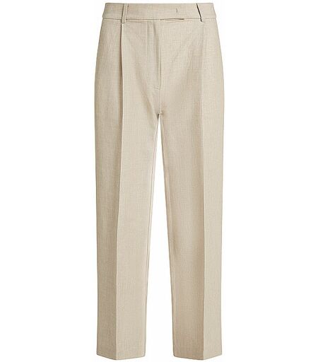 Damen Chino aus Viskose-Leinen-Mischung Mittelhoher Bund Schließt mit verdecktem Haken- und Reißverschluss Paspelierte Gesäßtaschen Bügelfalten Unifarben Gerader Beinverlauf Farbbezeichnung: Beige Material: 47% recycelter Polyester, 20% nachhaltige Viskose, 32% Leinen, 1% Elasthan ...