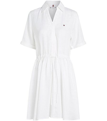 Damen Minikleid aus reinem Leinen V-Ausschnitt mit Kragen Kurzarm Tunnelzug in der Taille Logo-Flag an der Brust Knieumspielend Unifarben Farbbezeichnung: White Material: 100% Leinen ...