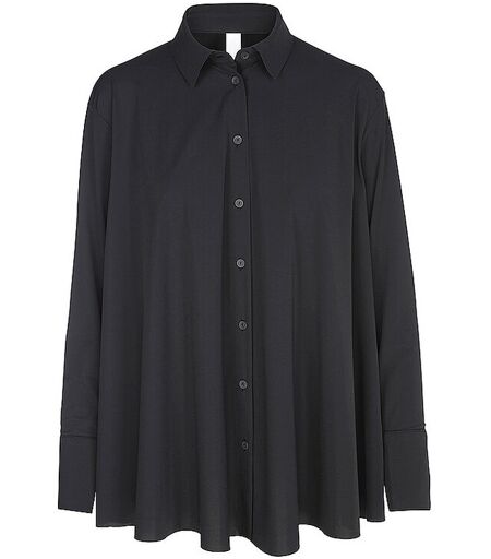 Damen Bluse aus elastischem Jersey Hemdblusenkragen Langarm Schließt mit Knopfleiste Lockere Passform Unifarben Farbbezeichnung: Deep Black Material: 73% Polyamid 27% Elasthan ...