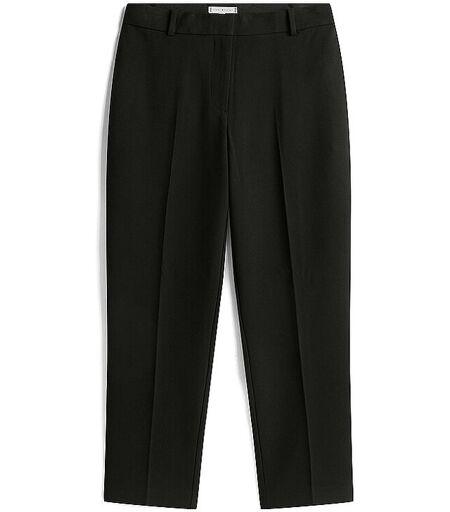 Damen Businesshose aus Viskose-Mischung mit Stretch-Anteil Mittlere Leibhöhe Schließt mit verdecktem Haken-, Ösen- und Reißverschluss Seitliche Eingrifftaschen Paspelierte Gesäßtaschen Bügelfalten Gerader Beinverlauf 7/8 Länge Unifarben Farbbezeichnung: Black Material: 68% recycelter Polyester, 28% Viskose, 4% Elasthan ...