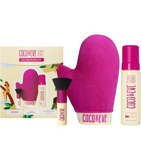 Ein dreiteiligen Selbstbräuner-Set von Coco & Eve. Das Bali Bronzing Kit in Medium enthält den meistverkauften Sunny Honey Schaum der Marke und zwei Auftragen-Accessoires, mit denen du die perfekte bronzefarbene Basis erzielst.Das Set enthält:Sunny Honey Bali Bronzing Foam Medium 200 mlDer tropisch duftende Selbstbräuner wurde mit einem einzigartigen CellushapeTM-Komplex entwickelt und kaschiert sichtbar unregelmäßige Texturen für ein glatteres Ergebnis. Die leichte, nicht klebrige Formel entwickelt sich in nur zwei Stunden und hinterlässt ein natürlich aussehendes, goldenes Strahlen ohne Streifen.Sunny Honey Deluxe Vegan Kabuki BrushDer Kabuki-Pinsel ist mit besonders weichen, feinen Borsten gefertigt und erreicht problematische Bereiche wie Hände, Füße und Gesicht.Sunny Honey Soft Velvet Self Tan MittDer plüschige Selbstbräunerhandschuh aus hypoallergenem Material verteilt die schäumende Formel mühelos und gleichmäßig auf der Haut und hinterlässt eine makellos aussehende Farbe. ...