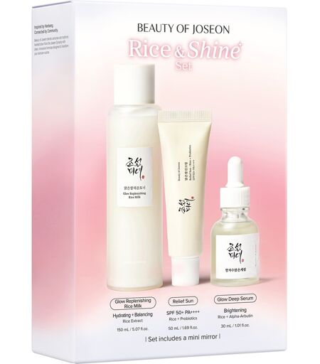 Harnessing the power of Korean ingredients, the LOOKFANTASTIC X Beauty of Joseon Rice & Shine Set features three full-sized formulas to enhance your morning routine. Set Contents: Rice + Probiotics Toner 150ml A nourishing toner that helps to soothe the feeling of sensitive skin while adding a nutrient-rich veil of hydration. Made with 77% rice extract and fermented ingredients, the formula enhances the absorption of your subsequent products while boosting radiance. Glow Deep Serum Rice + Arbutin 30ml Powered by 68% rice bran water, the serum helps to diminish the look of dark spots and discolouration, leaving a radiant, more unified complexion. Antioxidant-rich 2% arbutin and soybean seed protect against post-blemish marks, pigmentation and uneven tone to promote a clarified appearance, while glycerin provides long-lasting hydration for a coveted glass-like illusion. Relief Sun Rice + Probiotics SPF50+ PA++++ 50ml Ideal for dry, sensitive skin types, this lightweight sunscreen offers SPF 50+ PA defence with a luminous, non-oily feel. Enriched with rice extract and probiotics, it nourishes the skin barrier and locks in long-lasting moisture. ...
