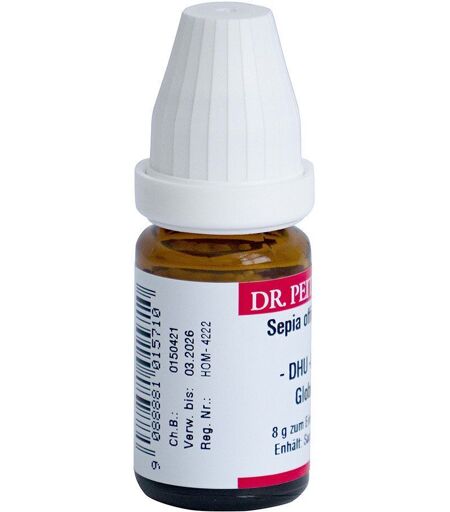 Homöopathische Arzneispezialität. 8 g Globuli zum Einnehmen. enthält Laktose in geringsten Mengen und Saccharose Arzneimittel für Kinder unzugänglich aufbewahren handpotenziert Ausgewählter Stoff: Sepia Deutsche Bezeichnung: Tintenfisch Synonyme: Sepia officinalis,Sepia succus Lateinische Bezeichnung: Sepia Reg.-Inhaber: DHU, Karlsruhe, Deutschland ...