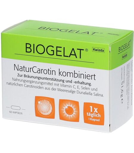 Nahrungsergänzungsmittel sind kein Ersatz für eine ausgewogene und abwechslungsreiche Ernährung und eine gesunde Lebensweise. Zur Bräunungsunterstützung und Bräunungserhaltung. Was NaturCarotin hat, hat BIOGELAT®Carotinoide sind natürliche Farbstoffe, die Pflanzen ihre wunderschönen Farben verleihen, zum Beispiel das herrliche Rot von saftigen Tomaten oder das leuchtende Orange von Karotten.Es war aber nicht Eitelkeit, weshalb die Natur Carotinoide erschaffen hat, sondern ein anderer wichtiger Grund: Carotinoide schützen Pflanzenzellen vor übermäßiger UV-Bestrahlung. Und dieser Schutz gilt natürlich auch für den Menschen.Um im Urlaub Sonne ohne Reue genießen zu können, muss der Körper als Schutzschild mit einer größeren Menge an Carotinoiden versorgt werden. Zur Bräunungsunterstützung und Bräunungserhaltung sollten Sie deshalb für eine ausreichende und regelmäßige Zufuhr von Carotinoiden sorgen. Die in BIOGELAT® NaturCarotin kombiniert enthaltenen Carotinoide werden aus einer der carotinoidreichsten Pflanzen der Welt, der australischen Meeresalge (Dunaliella Salina) gewonnen, und sind natürlich auch frei von Farbstoffen. Zudem tragen auch die enthaltenen Antioxidantien Vitamin C und Vitamin E dazu bei, freie Radikale von innen heraus unschädlich zu machen und Zellschäden entgegenzuwirken. Zutaten: pflanzliche Öle, Soja, Gelatine, Zucker, Feuchthaltemittel: Glycerin, L-Ascorbinsäure, pflanzliche Fette (Soja, teilweise gehärtet), Milchfett, D-alpha Tocopherol, natürliche Carotinoide, Acerolafruchtpulver, Natriumselenit, Maltodextrin, Emulgator: Soja-Lecithin, Aroma. Zusammensetzungpro 100 gpro Kapsel (=Tagesempfehlung)Brennwert2209 kJ/ 581 kcal19 kJ/ 5 kcalEiweiß16 g0,14 gKohlenhydrate28 g0,24 gdavon Zucker18,7 g0,16 gFett39 g0,3 gdavon gesättigte Fettsäuren7 g<0,1 gBallaststoffe<0,1 g<0,1 gNatrium<0,1 g<0,1 gVitamin A**91100 µg (11387 %*)783 µg (98 %*)Vitamin C6977 mg (8721 %*)60 mg (75%*Vitamin E2093 mg (17442 %*)18 mg (150 %*)Selen5810 µg (10546 %*)50 µg (91 %*)* der empfohlenen Tagesdosis gemäß Nährwertkennzeichnungsverordnung** berechnet auf β-Carotin der AlgensuspensionVerzehrempfehlung:Nur 1 x täglich 1 Kapsel mit ausreichend Flüssigkeit.Hinweis:Die angegebene empfohlene Tagesmenge darf nicht überschritten werden.Aufbewahrung: Kühl (6-25 °C) und lichtgeschützt lagern. Außerhalb der Reichweite von Kindern aufbewahren.Nettofüllmenge:60 KapselnHerstellerdaten:Kwizda Holding GmbHUniversitätsring 61010 Wien ...