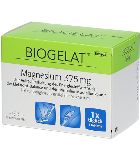 Nahrungsergänzungsmittel sind kein Ersatz für eine abwechslungsreiche Ernährung. Eine ausgewogene Ernährung und eine gesunde Lebensweise sind wichtig. BIOGELAT® Magnesium 375 mgWarum wird BIOGELAT® Magnesium 375mg eingenommen?Zur Aufrechterhaltung des Energiestoffwechsels, der Elektrolyt-Balance und der normalen Muskelfunktion.Was ist Magnesium und was bewirkt es?Magnesium ist ein bedeutsamer, in der Zelle wirksamer Mineralstoff. Magnesium trägt zu einer normalen Muskelleistung, insbesondere des Herzmuskels, bei und hat maßgeblichen Einfluss auf das gesamte Energiestoffwechselgeschehen im Organismus. Es dämpft die Erregbarkeit der Nerven und wird deshalb auch als Antistress-Mineral“ bezeichnet. Eine ausreichende Zufuhr von Magnesium trägt zur normalen Herzleistung und damit dem Kreislauf bei, beruhigt die Nerven, vermindert Ermüdungserscheinungen und entspannt“ die Muskulatur.Zutaten: Magnesiumoxid (36%); Kaliumhydrogencarbonat; Trennmittel: Polyvinylpyrrolidon; Füllstoff: Cellulose, Carboxymethylcellulose, Cellulosepulver; Festigungsmittel: Siliciumdioxid; Trennmittel: Calciumsalze von Speisefettsäuren; Überzugsmittel: Talkum, Schellack; Olivenöl; Farbstoff: .Nährwerte: Durchschnittliche Nährwerte pro 100 g pro Tablette (=Tagesempfehlung)Brennwert47,9 kJ /11,4 kcal 0,5 kJ / 0,1kcalEiweiß ...