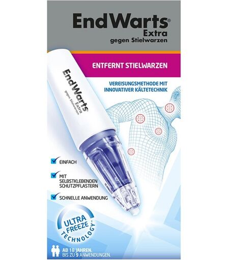 Stielwarzen sind harmlos und nicht ansteckend und können durch Vereisung entfernt werden, wenn sie als störend empfunden werden. EndWarts EXTRA: Stielwarzen sofort Vereisung + 9 Schutzpflaster ist die kälteste verfügbare Methode zur Entfernung von Stielwarzen für zu Hause. Wirkungsweise von EndWarts EXTRA: Stielwarzen sofort Vereisung + 9 SchutzpflasterEndWarts EXTRA: Stielwarzen sofort Vereisung + 9 Schutzpflaster enthält Distickstoffmonoxid, dieses erreicht eine Temperatur von etwa ca. -80 °C und vereist die Warze wirksam bis in die tiefsten Gewebeschichten.Wirkstoffe / Inhaltsstoffe / ZutatenEndWarts EXTRA: Stielwarzen sofort Vereisung + 9 Schutzpflaster enthält: