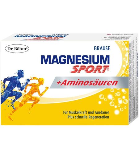 Sollte nicht konsumiert werden, wenn Sie am selben Tag andere Produkte konsumieren, die grünen Tee enthalten. Sollte nicht von schwangeren oder stillenden Frauen und Kindern unter 18 Jahren konsumiert werden. Sollte nicht auf leeren Magen konsumiert werden.Nahrungsergänzungsmittel sind kein Ersatz für eine ausgewogene, abwechslungsreiche Ernährung und eine gesunde Lebensweise.Dr. Böhm® Magnesium Sport® + Aminosäuren Brause ermöglicht es Ihnen jederzeit die volle sportliche Leistung zu erbringen. Der erfrischende Brause-Drink mit einer ausgewogenen Kombination aus Aminosäuren, Elektrolyten, Vitaminen, Spurenelementen und wertvollen Pflanzenstoffen ist ideal, um die Nährstoffdepots des Körpers vor, während und nach dem Sport aufzufüllen.Vorteile: Volle sportliche Leistung jederzeit Die verzweigtkettigen Aminosäuren (BCAAs) stehen den Muskeln sofort zur Verfügung Optimales Verhältnis der BCAAs Leucin, Isoleucin, Valin von 2:1:1 Magnesium und Kalzium unterstützen die normale Muskelfunktion, wie auch die Muskelkraft Beitrag zur Reduktion von Müdigkeit und Erschöpfung nach dem Sport sowie zu einem gesunden Energiestoffwechsel durch den Vitamin B-Komplex und MagnesiumDr. Böhm® Magnesium Sport® + Aminosäuren wird regelmäßig auf ausgewählte doping-relevante Substanzen überprüft und die Ergebnisse auf der Kölner Liste dokumentiert.www.koelnerliste.com Anwendungsgebiet: Egal, ob Hobby- oder Leistungssportler – durch Ihr Training wollen Sie Ihre körperliche Leistungsfähigkeit verbessern. Genauso wichtig wie wohldosierte Trainingsreize sind auch die Regenerationsphasen. Denn während der Regeneration repariert der Körper entstandene Mikroschäden in der Muskulatur und passt sich an die gesetzten Reize an – so steigert sich die Leistung. Dr. Böhm® Magnesium Sport® + Aminosäuren versorgt Sie als Fitness Supplement mit einer ausgewogenen Kombination aus Aminosäuren, Magnesium, Kalium, Vitaminen, Spurenelementen und wertvollen Pflanzenstoffen – für volle Leistung beim Sport und die schnelle Regeneration danach. Dr. Böhm® QualitätsgarantieDr. Böhm® verbindet die geballte Kraft der Natur mit aktuellen wissenschaftlichen Erkenntnissen. So entstehen hochwirksame Produkte, die mit optimal aufeinander abgestimmten Inhaltsstoffen ganz Ihrer Gesundheit gewidmet sind. Sowohl Arznei- als auch Nahrungsergänzungsmittel von Dr. Böhm® werden nach höchsten pharmazeutischen Standards produziert. Zertifizierte Herstellungsstandards und höchste Produkt-Qualität Optimale Dosierung und einfache Anwendung Produktion ausschließlich in Österreich, Deutschland und der SchweizZutaten: Säuerungsmittel Citronensäure, Leucin, Argininaspartat, Isoleucin, Valin, L-Carnitintartrat, Kaliumcarbonat, Magnesiumoxid, Taurin, Füllstoff Mannit, Kaliumbicarbonat, Säureregulator Natriumcarbonate, Aromen (Lemon, Zitrone), Magnesiumsalze der Zitronensäure, Süßungsmittel Cyclamat, Magnesiumcarbonat, Ascorbinsäure, Grüntee-Extrakt, Zinksulfat, Süßungsmittel Saccharin, Kaliumchlorid, Nicotinamid, Emulgator... ...