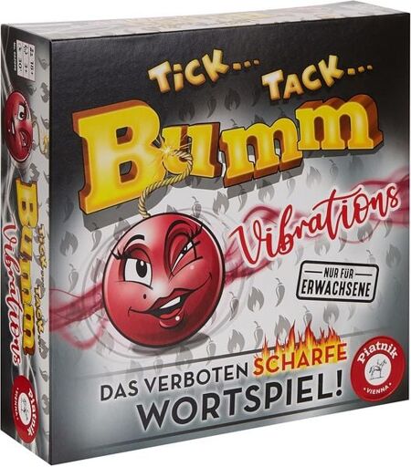 Tick Tack Bumm Vibrations - Hauptakteur dieser Tick Tack Bumm Ausgabe ist eine Tickende Bombe, die dieses Mal ganz besonders exklusiv ausfällt: In einem kräftigen Beerenrot gehalten gibt sie nicht nur den Takt vor,, sondern vibriert auch noch in zuä¤lligen AbstÃäden. So müssen zu schlüpfrigen Kategorien passende Begriffe gefunden werden. Erst dann darf die Bombe weitergegeben werden. Bei wem sie allerdings vibriert, der muss nicht lange überlegen: Er darf die Bombe sofort einem beliebigen Sitznachbarn weitergeben, ohne einen Begriff nennen zu müssen. ...