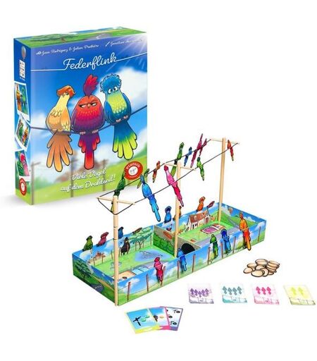 „Federflink“ von Piatnik ist ein fesselndes und optisch ansprechendes Kinderspiel für 2-4 Spieler ab 7 Jahren. In diesem dynamischen Spiel schlüpfen die Teilnehmer in die Rollen von Wuschelmeisen, Langfederfinken und Wellenstaren, die sich auf Drahtseilen in Pose werfen, um das perfekte Selfie zu schießen. Mit variierenden Schwierigkeitsgraden und einem dreidimensionalen Spielaufbau, der Holzmasten und gespannte Drähte nutzt, bietet „Federflink“ sowohl eine kompetitive als auch eine kooperative Spielvariante. Die Spieler platzieren ihre Vögel so, dass sie den Abbildungen auf den Selfie-Karten entsprechen. Dabei ist Geschicklichkeit und eine gute Beobachtungsgabe gefragt, denn auch wenn man nicht am Zug ist, können Selfie-Karten erfüllt und Punkte gesammelt werden. Wenn ein Vogel das Gleichgewicht verliert und herunterfällt, erhalten die anderen Spieler als Entschädigung Eier, die strategisch eingesetzt werden können. Um den besten Platz für eine Selfie-Pose zu ergattern, dürfen die Vögel auch andere zur Seite schieben, allerdings nur mit der Vogelfigur und niemals mit den Händen. „Federflink“ beeindruckt nicht nur durch seinen innovativen Spielmechanismus, sondern auch durch die hochwertige 3D-Umsetzung und das farbenfrohe Design der Papier-Vögel. Das Spiel fördert räumliches Denken und feinmotorische Fähigkeiten, während es gleichzeitig für jede Menge Spaß und Spannung sorgt. Ausgezeichnet als „Spiele Hit Familie 2024“ von der Österreichischen Spiele-Akademie, ist „Federflink“ ein Muss für jede Spielesammlung. ...