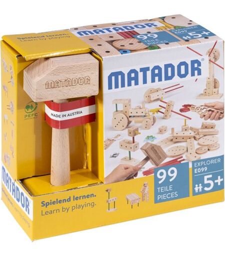 Explorer E099 Holz Konstruktionsbaukasten Der kleinste Matador Explorer-Baukasten rundet das Explorer-Programm nach unten ab. Mit seinen 99 Teilen und 42 Bau-Ideen bietet er einen perfekten Baueinstieg. Windmühle, Traktor, Vogel und noch viele weitere Modelle fördern die kreative und motorische Entwicklung unserer Kinder. - ab 5 Jahren - stabil und langlebig - 100% österreichisches Holz, 100% Made in Austria - Bauen von Funktionsmodellen - Bauen mit Hammer und Zange - Inhalt: 99 Teile - enthaltenes Werkzeug: Hammer, Zange - Vorlagenheft: Bauanleitung mit 42 Bauideen MATADOR Explorer Holz-Konstruktionsbaukästen sind weltweit einmalig für die kindgerechte Phantasieentwicklung und deren Realisierung. Sie bieten durch ihre für Holz einmalige Passgenauigkeit die Voraussetzung für einfache und komplexe Modelle. Präzisionsgebohrte Bauklötzen, passgenaue Verbindungsstäbchen, Achsen und Räder eine Bauvielfalt, die seit Generationen Jung und Alt fasziniert. Mit dem Matador Hammer können sowohl einfache Modelle, wie z.B. Flugzeuge, Autos, Männchen und vieles mehr, als auch komplizierte technisch anspruchsvolle und auch ganze Matador Landschaften gebaut werden. Dank praxisbewährter Erweiterungssets wie Zahnräder und Motor sind MATADOR Explorer-Baukästen ein anspruchsvolles Spielzeug, mit dem Kinder in ihrer Entwicklungsphase lernen, Theorie und Praxis sinnvoll zu verbinden. Sechs verschiedene Hauptkästen in unterschiedlichen Größen (von 99 bis 902 Bauteilen) und sinnvolle Ergänzungskästen bieten grenzenlose Baumöglichkeiten. build your world ...Nachhaltigkeit & Selbstverantwortung seit Generationen... Was man lernen muss, um es zu tun, das lernt man, indem man es tut. Nach diesem Wahlspruch entstanden vor über 115 Jahren in einer kleinen Werkstatt im 4. Wiener Bezirk die ersten MATADOR-Holzbaukästen. Das Konzept beruhte schon damals wie heute auf präzise vorgebohrten Holzklötzchen, Verbindungsstäbchen und Rädern, die zu unterschiedlichsten Figuren, Maschinen und Fahrzeugen zusammengebaut und wieder zerlegt werden können. Aufbauend auf dieser genialen Idee werden MATADOR-Holzbaukästen noch immer in Österreich aus heimischem Hartholz aus nachhaltig gepflegten Forsten produziert. Mit dem Ohr am Spielzeugmarkt kreieren wir, in der MATADOR-Technik, für unsere Kinder attraktive, nachhaltige Spielzeuge! ...