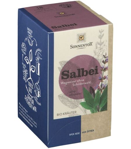 Bitte achten Sie auf eine abwechslungsreiche und ausgewogene Ernährung und gesunde Lebensweise.Bio-Kräuterteekräftig-würzigEin Universalkraut, das besonders in den Wintermonaten viele passende Lösungen parat hat.Und auch geschmacklich hat Salbei einiges zu bieten: fein würzig und frisch passt der Tee hervorragend zur mediterranen Küche.Im Aberglauben sagt man, dass wo der Salbei üppig wächst, eine starke Frau im Haus ist.Paracelsus höchstpersönlich war davon überzeugt, dass alleine der Gedanke an Salbei ein Wegweiser in schwierigen Situationen sei.Ein wahrlich wunderbares Kräutlein!Zutaten:Salbei bioVerzehrsempfehlung: Ziehzeit in Minuten: 5-10 / Wassertemperatur in °C: 100Lagerung:Vor wärme geschützt und trocken lagern.Nettofüllmenge:18 g DoppelkammerbeutelHersteller:SONNENTOR Kräuterhandelsgesellschaft mbH3910 Sprögnitz 10Österreich ...
