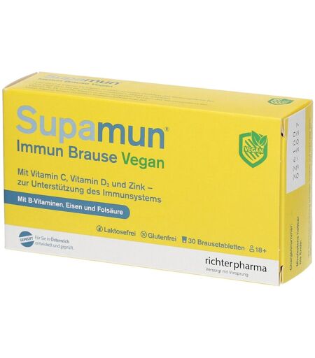 Bitte achten Sie auf eine abwechslungsreiche und ausgewogene Ernährung und eine gesunde Lebensweise.Supamun® Immun Brause Vitamin C ist ein essentielles Vitamin, welches das Immunsystem in seiner normalen Funktion unterstützt.trägt zu einer normalen Funktion des Immunsystems während und nach intensiver körperlicher Belastung bei.trägt dazu bei, die Zellen vor oxidativem Stress zu schützen.Zink wird für die Zellteilung benötigt. Das Spurenelement kann vom Körper nicht selbst hergestellt werden.trägt zu einer normalen Funktion des Immunsystems bei.trägt dazu bei, die Zellen vor oxidativem Stress zu schützen.hat eine Funktion bei der Zellteilung.Vitamin D3 kann grundsätzlich vom Körper in der Haut – durch die UVB Strahlung der Sonne – selbst hergestellt werden.trägt zur normalen Funktion des Immunsystems bei.hat eine Funktion bei der Zellteilung.Vitamin B2trägt zu einer normalen Funktion des Nervensystems bei.trägt zur Erhaltung normaler roter Blutkörperchen bei.trägt dazu bei, die Zellen vor oxidativem Stress zu schützen.Vitamin B6tragen zu einer normalen Funktion des Nervensystems bei.trägt zu einer normalen Funktion des Immunsystems (körperliche Abwehr) bei.trägt zur normalen Bildung roter Blutkörperchen bei.Vitamin B12tragen zu einer normalen Funktion des Nervensystems bei.trägt zu einer normalen Funktion des Immunsystems (körperliche Abwehr) bei.trägt zu einer normalen Bildung roter Blutkörperchen bei.hat eine Funktion bei der Zellteilung.Eisenträgt zu einem normalen Energiestoffwechsel bei.trägt zur normalen Bildung von roten Blutkörperchen und Hämoglobin bei.trägt zu einer normalen Funktion des Immunsystems bei.hat eine Funktion bei der Zellteilung.Folsäureträgt zu einer normalen Funktion des Immunsystems (körperliche Abwehr) bei.trägt zu einer normalen Blutbildung bei.hat eine Funktion bei der Zellteilung.Supamun® Immun Brause Vegan ist ein Nahrungsergänzungsmittel mit Vitamin C, Vitamin D3, Zink und weiteren Nährstoffen speziell für eine vegane und vegetarische Lebensweise.Zutaten:Säuerungsmittel: Citronensäure, Säureregulator: Natriumhydrogencarbonat, Füllstoff: Sorbit*, L-Ascorbinsäure, natürliches Aroma, Zinkpicolinat, färbendes Pflanzensaftkonzentrat (Rote Beete), Eisenpyrophosphat, Orangensaftpulver, Süßungsmittel: Sucralose, Farbstoff: Carotin, Pyridoxinhydrochlorid, Riboflavin, Folsäure, Cholecalciferol, Cyanocobalamin.* Kann bei übermäßigem Verzehr abführend wirkenNährwerte:Durchschnittliche Nährwerte:pro Brausetablette (4,2 g)% NRV*Vitamin C500 mg 625 %Vitamin D320 µg 400 %Vitamin B25,6 mg 400 %Vitamin B65,6 mg 400 %Vitamin B1225 µg 1000 %Folsäure 600 µg 300 %Zink15 mg 150 %Eisen10 mg 71 %Hinweis:Die angegebene empfohlene Tagesmenge darf nicht überschritten werden.Aufbewahrung:Kühl (6-25 °C) und lichtgeschützt lagern. Außerhalb der Reichweite von Kindern aufbewahren.Nettofüllmenge: 30 Brausetabletten Hersteller: Richter... ...
