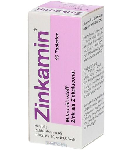 Nahrungsergänzungsmittel sind kein Ersatz für eine ausgewogene und abwechslungsreiche Ernährung und eine gesunde Lebensweise. Zinkamin® Tabletten Nahrungsergänzung mit Zink. Das Multitalent mit dem Spurenelement Zink reguliert über 300 Enzyme, schützt vor oxidativem Stress und unterstützt das Immunsystem. Reines Zinkpräparat Zink ist ein lebensnotwendiges Spurenelement das mit der Nahrung zugeführt werden muss. Zink in Gluconatform kann vom Körper besonders gut aufgenommen werden zur Unterstützung des Immunsystems für gesunde und schöne Haut, Haare und Nägel schützt die Zellen vor oxidativem Stress unterstützt die Aufnahme von Vitamin A und trägt zur Erhaltung der Sehleistung bei zur Unterstützung vieler Stoffwechselvorgänge spielt eine Rolle im ZellteilungsprozessZum Ausgleich eines Zinkmangels z.B. aufgrund einer Störung der Aufnahme oder einer sehr einseitigen Ernährung z.B. ballaststoff(phytat)reich. Bei einem allgemein geschwächten Immunsystem besonders in der Grippezeit. Bei einer erhöhten Belastung durch freie Radikale aufgrund schädlicher Umweltbelastungen (wie z. B. Schwermetalle, Ozon, UV-Strahlung, Stickoxide), Stress, Alkohol- und Nikotinkonsum oder bei Entzündungen.Zutaten: Dicalciumphosphat, Zinkgluconat, Kartoffelstärke, Zellulose, Trennmittel: E 470b.Inhaltsstoffe:1 Tablette enthält: 10 mg Zink (= 100% der in der EU empfohlene Tagesdosis)Verzehrempfehlung: 1 Tablette täglich etwa 1 Stunde vor einer Mahlzeit unzerkaut mit Flüssigkeit einnehmen.Aufbewahrung:Außerhalb der Reichweite von kleinen Kindern lagern. Trocken und nicht über Raumtemperatur lagern!Nettofüllmenge: 90 TablettenHerstellerdaten: Richter Pharma AG Feldgasse 19 4600 Wels Österreich ...