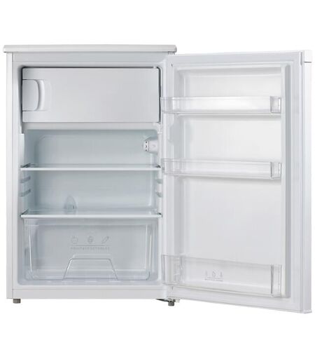 Verbrauchs-Eigenschaften Angabe gem. EU-Verordnung 2019/2016; Energieeffizienzklasse E; Spektrum [A bis G]; 142 kWh/Jahr Energieverbrauch; Leistungseigenschaften Klimaklasse SN/T; Nutzinhalt Kühlraum: 113 l; Nutzinhalt Gefrierfach: 16 l; 4-Sterne-Gefrierfach; Vollraumkühlung; Geräusch-Schallleistung: 39 dB; Geräuschemissionsklasse C; Bedienung wählbare Kühlteil-Temperatur; Kühlraum-Ausstattung LED-Innenraum-Beleuchtung; 2 Sicherheitsglasplatten; Anzahl der Gemüseschalen: 1; Innentür-Ausstattung 3 Türregale; Gehäuse-Eigenschaften Breite: 55,3 cm; Höhe: 84,5 cm; Tiefe: 57,4 cm; Leergewicht: 28 kg; Anzahl der Türen: 1; Tür-Anschlag wechselbar; höhenverstellbare Gerätefüße; Farben weiß; ...