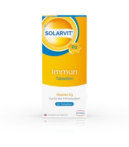 Nahrungsergänzungsmittel sind kein Ersatz für eine ausgewogene und abwechslungsreiche Ernährung und eine gesunde Lebensweise.SOLARVIT® steht für gut bioverfügbares Vitamin D3 unterschiedlich hoch dosierte Produkte, je nach individuellem Bedarf eine Einnahme unabhängig von den Mahlzeiten sinnvoll kombinierte Vitamine und MineralstoffeDank der breiten Produktpalette finden Sie genau das SOLARVIT®-Produkt, das zu Ihnen passt - maßgeschneidert auf Ihren Bedarf. Vitamin D3 für Ihr Immunsystem: Das Sonnenvitamin D hat eine Schlüsselfunktion für unsere Gesundheit. Bei vielen Vorgängen im Körper hat es seine Finger im Spiel. So ist es ein besonderer Freund Ihrer Abwehrkräfte und unentbehrlich für Knochen und Zähne. Darüber hinaus hilft es mit, die Muskelfunktion zu erhalten.Solarvit® Immun:SOLARVIT® Immun Tabletten und Tropfen mit Vitamin D3 – für jeden Tag, individuell und einfach dosierbar Nur 1 x täglich Vegetarisch Frei von Laktose, Hefe, Gelatine und Konservierungsstoffen Hergestellt in ÖsterreichZutaten:Süßungsmittel Isomalt, Trennmittel Magnesiumsalze von Speisefettsäuren, Vitamin D3 (Zubereitung)Nährwerte: Nährwerte pro Tablette Vitamin D3 25 µg Verzehrempfehlung:Täglich 1-2 Tabletten mit etwas Flüssigkeit einnehmen. Die Tablette kann gekaut, gelutscht oder unzerkaut eingenommen werden und ist leicht zu schlucken. Eine regelmäßige Nahrungsergänzung über einen längeren Zeitraum ist empfehlenswert.Hinweis:Die angegebene empfohlene tägliche Verzehrmenge darf nicht überschritten werden.Aufbewahrung:Kühl (6-25 °C) und lichtgeschützt lagern. Außerhalb der Reichweite von Kindern aufbewahren.Nettofüllmenge:60 Tabletten Herstellerdaten: STADA Arzneimittel GmbHMuthgasse 361190 WienÖsterreich ...