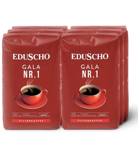 EDUSCHO Gala Nr. 1 - 6x 500g Ganze Bohne Aufbewahrungshinweise: Kühl und trocken lagern, Am Besten bewahren Sie die angebrochene Packung luftdicht, z.B. in einer Aromadose auf. Zubereitungsempfehlung: Unser Eduscho Gala Nr. 1 ist vielfältig in der Zubereitung - von Pour Over bis Vollautomat. Wussten Sie schon, dass die Zubereitungsart den Geschmack beeinflusst? Die optimale Menge Kaffee pro Tasse ist 7 - 9 g (= ein gestrichenes Kaffeelot). Die beste Kaffeekomposition für höchste Ansprüche.Einzigartig feine und ausdrucksvolle Geschmacksfülle ...