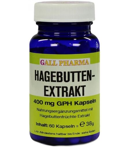 Wirkungsweise von Hagebuttenextrakt 400 mg Gph KapselnHagebutten sind die Früchte der Heckenrose (Rosa canina L. aus der Familie der Rosengewächse). Weitere Synonyma sind Hainrose, Hundsrose und Wilde Heiderose. Es handelt sich um einen Strauch, der ein bis mehrere Meter hoch wird. Diese Pflanze stammt aus Europa und Nordafrika. Die Hagebutte weist einen außerordentlich hohen Vitamin C Gehalt auf. Außerdem enthält sie u.a. Polyphenole, Fruchtsäuren, Provitamin A, Vitamin E, Mangan und Bor. Lycopin verleiht dieser Frucht die rote Farbe.