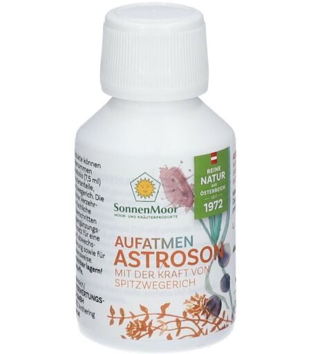 Nahrungsergänzungsmittel sind kein Ersatz für eine ausgewogene und abwechslungsreiche Ernährung und eine gesunde Lebensweise. Der flüssige Kräuterauszug Astroson ist ein Produkt der Firma SonnenMoor. Dieses Nahrungsergänzungsmittel ist ein reines Naturprodukt und frei von chemischen Zusätzen oder Konservierungsstoffen. Das Nahrungsergänzungsmittel unterstützt die Schleimlösung der Atemwege. Die Kombination von schleimlösenden Kräutern wie Anserine, Bibernellwurzel, Meisterwurz, Wacholderbeeren, Frauenmantel, Süßholzwurzel, Kalmuswurzel, Spitzwegerich, Kamille, Löwenzahnkraut und Quendel sorgt für ein angenehmes und harmonisierendes Gefühl in Hals und Rachen. Aufgrund seiner vielfältigen Einsatzmöglichkeiten sollte dieser natürliche Schleimlöser und Hustenlöser in keiner Hausapotheke fehlen.SonnenMoor Astroson ist bestens mit anderen Kräuterauszügen der Firma SonnenMoor wie Lumison und Gurgelwasser sowie dem Trinkmoor kombinierbar. Nahrungsergänzungsmittel sind kein Ersatz für eine ausgewogene und abwechslungsreiche Ernährung und gesunde Lebensweise. Unterstützt die Schleimlösung Stärkt die Atmungsorgane Wertvolles Kräutermittel für die Atemwege bei Husten Fördert das Abhusten Inhaltstoffe - Zutaten:72 % Wasser, 15 % Trinkalkohol, 13 % Kräuterextrakt aus: Anserine, Bibernellwurzel, Meisterwurz, Wacholderbeeren, Frauenmantel, Süßholzwurzel, Kalmuswurzel, Spitzwegerich, Kamille, Löwenzahnkraut, Quendel.Alkohol 15 % Vol. Frei von künstlichen Farbstoffen Frei von künstlichen Aromen Ohne Konservierungsstoffe Ohne Zuckerzusatz - Laktosefrei Vegan Glutenfrei kein Moor enthalten VerzehrsempfehlungTäglich 3 x 40 Tropfen Astroson mit Wasser oder Fruchtsaft trinken. Alle SonnenMoor-Produkte können miteinander eingenommen werden. Hinweis: Die angegebene empfohlene Tagesmenge darf nicht überschritten werden. Aufbewahrung: Kühl (6-25 °C) und lichtgeschützt lagern. Außerhalb der Reichweite von Kindern aufbewahren. Nettofüllmenge: 100 gHersteller:SonnenMoor GmbHLandstraße 145102 Anthering ...