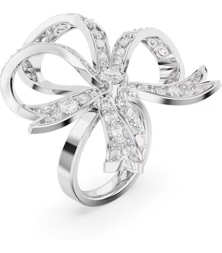 Dieser einzigartige Volta Cocktailring sorgt für einen lässigen Style, der die Eleganz direkt in Ihre Hände legt. Das von einer Schleifenform inspirierte Design ist rhodiniert und mit einer Reihe an hellen, klaren Kristallen geschmückt, die mit der Chattonage-Technik gesetzt wurden. Zwei große Elemente sorgen für noch mehr Wirkung, wobei ein rundes Element in der Mitte der Schleife imponiert, während das andere in Tropfenform unter ihr hängt. Tragen Sie diesen Ring als Statement der modernen Eleganz oder schenken Sie ihn als eine romantische Aufmerksamkeit. ...