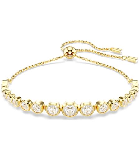 Dieses vergoldete Armband ist für alltägliche Eleganz gemacht und strahlt die Schlichtheit der Imber-Familie aus. Das Design zeichnet sich durch einen Farbverlauf aus klaren, rund geschliffenen Kristallen aus, die jeweils in einer modernen Lünettenfassung an einer weichen Kette mit einem Schiebeverschluss für bequemes Tragen angebracht sind. Farbe: Weiß Material: Goldfarbenes Finish, Kristalle Breite: 0,6 cm Maximale Länge: 24 cm ...