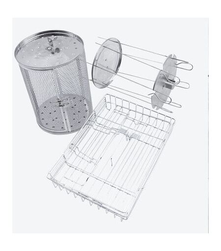 Bestehend aus Dreh- und Universalkorb, Spießen Für knusprige Pommes, Popcorn Auch für Fisch, Gemüse, Schaschlik Aus robustem Edelstahl Zubehör-Set zum rauchfreien Tischgrill mit Drehspieß (Nr. 344G03). Pommes-Drehkorb Edelstahl, Ø 14 cm, 18,5 cm lang, Schaschlik-Spieß 49 cm lang. Fisch-/Gemüse-Garkorb 23 x 17 x 4,5 cm (B/T/H). ...
