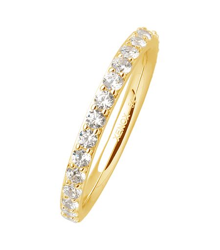 Dieses Schmuckstück darf in keinem Schmuckkästchen fehlen! Der Damenring lässt sich vielseitig kombinieren und glänzt in 18 Karat vergoldetem 925/- Sterlingsilber. Helle Zirkonia-Steine schimmern wunderschön im Licht und machen ihn zu einem Blickfang. Material: 925 Sterling Silber Stein: Zirkonia Ringweite: 56 ...