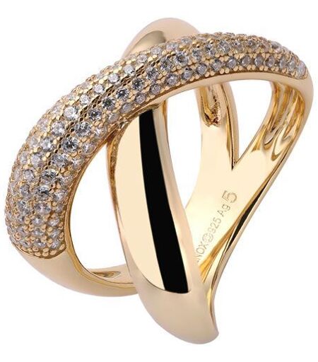 Dieser ausgefallene Damenring bei dem sich zwei Schienen überkreuzen, ist ein elegantes Accessoire, das jedem Look einen Hauch von Glamour verleiht. Material: Sterling Silber vergoldet Farbe: goldfarben Steine: Zirkonia Ringgröße: 54 ...