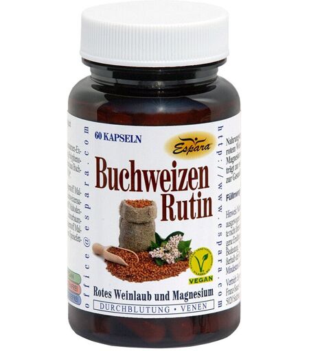 Anwendungsgebiet von Buchweizen Rutin KapselnBuchweizen Rutin Kapseln sind ein Nahrungsergänzungsmittel mit Buchweizen, Rutin, rotem Weinlaub und dem Mineralstoff Magnesium. Ein Beitrag zur Gesundheit der Venen. Magnesium spielt eine Rolle in der Zellteilung und trägt zur normalen Muskelfunktion bei.Wirkstoffe / Inhaltsstoffe / ZutatenZutaten von Buchweizen Rutin Kapseln: