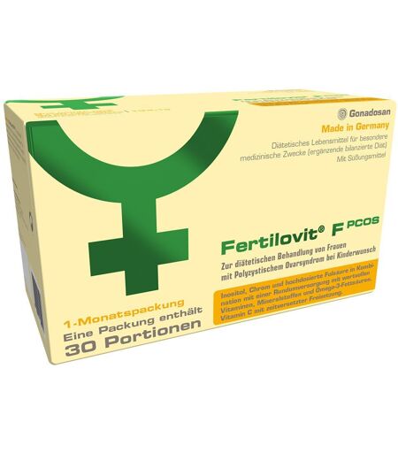 Bitte achten Sie auf eine abwechslungsreiche und ausgewogene Ernährung und gesunde Lebensweise.Diätetisches Lebensmittels für besondere medizinische Zwecke - zur diätetischen Behandlung von Frauen mit Polyzystischem Ovarsyndrom bei Kinderwunsch.Hoch dosierte Folsäure, Inositole und N-Azetyl-L-Cystein in Kombination mit einer umfassenden Versorgung an Antioxidantien, Vitaminen und Mineralstoffen.Vitamin C mit zeitversetzter Freisetzung. Die Inhaltsstoffe tragen zu einem ausgeglichenen Blutzuckerspiegel, der Regulierung des Hormon- und Homocysteinstoffwechsels und dem Schutz der Zellen vor oxidativem Stress bei.Gesundheitsvorsorge beginnt bereits vor der Empfängnis. Bei Kinderwunsch sollte jede Frau verstärkt auf eine gesunde Lebensführung mit einer vollwertigen und gesundheitsbewussten Ernährung achten. Dabei sind insbesondere bestimmte Vitamine und Mineralstoffe von großer Bedeutung für die Gesundheit von Mutter und Kind. Für eine optimale Versorgung kann die gezielte Ergänzungvon wichtigen Mikronährstoffen sinnvoll sein.Frauen mit Polyzystischem Ovarsyndrom (PCOS) haben dabei aufgrund ihrer Erkrankung besondere ernährungsphysiologische Erfordernisse.Das Polyzystische Ovarsyndrom (PCOS). Bei PCOS handelt es sich um ein Krankheitsbild, das auf erhöhten männlichen Hormonen im Blut beruht. Klinisch macht sich das Syndrom durch unregelmäßige bis fehlende Menstruationsblutungen, Insulinresistenz und äußerliche Veränderungen wie verstärkte Körperbehaarung, Akne, Haarausfall und Übergewicht bemerkbar. Es müssen jedoch nicht immer alle Symptome vorhanden sein. Viele Frauen leiden zudem unter unerfülltem Kinderwunsch. Bei 70% der betroffenen Frauen wird in der gynäkologischen Ultraschalluntersuchung eine vermehrte Bildung von Eibläschen (Follikel) in den Eierstöcken festgestellt, die häufig auch als Zysten bezeichnet werden und namensgebend für das Krankheitsbild sind. Während das Polyzystische Ovarsyndrom selbst leider nicht heilbar ist, so kann eine angemessene Ernährung doch einen Beitrag zurUnterstützung des Körpers, insbesondere bei Kinderwunsch leisten.Fertilovit F PCOS ist glutenfrei und laktosefrei.Zutaten: Vitamin- und Mineralstoffkapsel: L-Carnitin-L-Tartrat, Hydroxypropylmethylcellulose, Nicotinamid, Coenzym Q10, D-alphaTocopherylacetat, Zinkoxid, Lycopin-Oleoresin aus Tomaten, Calcium-D-pantothenat, Mangansulfat, Pyridoxinhydrochlorid, Thiaminhydrochlorid, Riboflavin, Farbstoff , Pteroylmonoglutaminsäure, Chrom-(III)-Chlorid, Kaliumjodid, D-Biotin, Natriumselenit, Cholecalciferol, Cyanocobalamin. Omega-3-Kapsel: Fischöl, Gelatine (Rind), Feuchthaltemittel Glycerin, Antioxidationsmittel alpha-Tocopherol, Wasser. Pulverstick: Myo-Inositol, Magnesiumoxid, N-Acetyl-L-Cystein, L-Ascorbinsäure, D-chiro-Inositol, Süßungsmittel Steviolglycoside, Überzugsmittel Ethylcellulose. Nährwerte Pro 100 g Pro Tagesportion Brennwert (kJ/kcal) 1310 kJ (312 kcal) 58 kJ (13,8 kcal) Fett davon gesättigte Fettsäuren 9 g 1 g 0,4 g ...