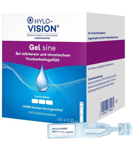 Anwendungsgebiet von Hylo-Vision Gel Sine EinzeldosispipettenHylo-Vision Gel Sine Einzeldosispipetten sind Augentropfen bei stärkerem und chronischem Trockenheitsgefühl der Augen. Stärkere und chronische Symptome von trockenen Augen erfordern eine intensive Befeuchtung der Augenoberfläche. Die Hylo-Vision Gel Sine Einzeldosispipetten beinhalten 0,3% Hyaluronsäure. Die hochviskose Konsistenz bietet einen lang haftenden, stabilen Feuchtigkeitsfilm, womit die Symptome langanhaltend gelindert werden. Die Augentropfen eignen sich auch ideal für unterwegs. Dank ihrer wiederverschließbaren Ein-Dosis-Behältnisse können sie bis zu 12 Stunden nach dem Öffnen verwendet werden. Hylo-Vision Gel Sine Einzeldosispipetten sind frei von Konservierungsmitteln und kann auch bei längerem Gebrauch eine hohe Anwendungssicherheit bieten. Die Augentropfen eignen sich auch für Kontaktlinsenträger und können den Tragekomfort deutlich verbessern.