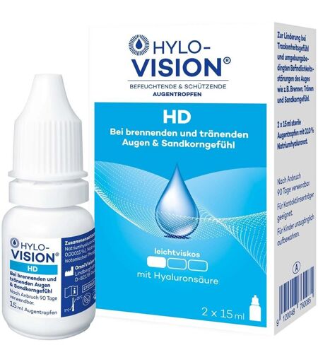 HYLO-VISION® HD Augentropfen werden zur Linderung von brennenden, tränenden Augen und dem sogenannten Sandkorngefühl angewendet. Sie sind besonders geeignet für Personen, die unter trockenen Augen leiden, verursacht durch Bildschirmarbeit, Kontaktlinsen oder Umwelteinflüsse wie trockene Raumluft. Anwendung Träufeln Sie 1 bis 2 Tropfen HYLO-VISION® HD in den Bindehautsack jedes Auges. Die Anwendung kann nach Bedarf erfolgen. Bei Verwendung mit Kontaktlinsen bringen Sie 1 bis 2 Tropfen auf jede Linse auf, bevor Sie diese einsetzen. Die Augentropfen können auch während des Tragens von Kontaktlinsen verwendet werden. Verschließen Sie die Flasche nach der Anwendung gut. Zusammensetzung HYLO-VISION® HD enthält 0,1 % Hyaluronsäure. Die Augentropfen sind leichtviskos und enthalten ein sanftes Konservierungsmittel, Polyhexanid, das die Lösung vor Kontamination schützt. Weitere Bestandteile sind: Hyaluronsäure Polyhexanid Wasser Hilfsstoffe zur Stabilisierung der Lösung ...