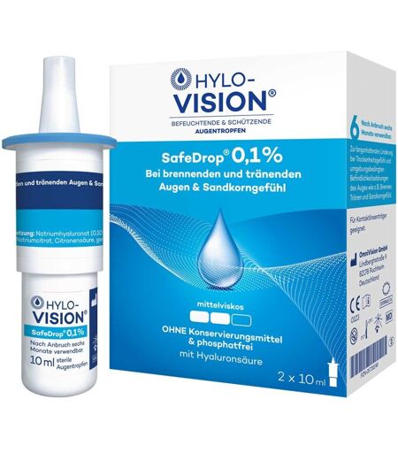 Anwendungsgebiet von Hylo-Vision Safedrop 0,1% AugentropfenHylo-Vision Safedrop 0,1% Augentropfen sind benetzende Augentropfen, die zur Befeuchtung und zum Schutz der Augenoberfläche dienen. Verschiedene Gegebenheiten wie das Arbeiten am PC, das Tragen von Kontaktlinsen, trockene Raumluft, Umweltstress oder bestimmte Erkrankungen können das Auge beeinflussen, sodass es beispielswiese nicht mehr mit ausreichend Tränenflüssigkeit benetzt wird. Zu den typischen Symptomen zählen brennende, tränende und gerötete Augen. Außerdem ist ein unangenehmes Fremdkörpergefühl möglich, was als Sandkorngefühl bezeichnet wird.