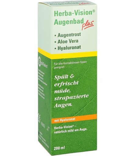 Anwendungsgebiet von Herba-Vision Augenbad plusHerba-Vision Augenbad plus beinhalten Augentrosttinktur, Aloe Vera und natürliches Hyaluronat. Sie dienen zur besseren befeuchtung der Augen, insbesondere beim Tragen von Kontaktlinsen.Wirkungsweise von Herba-Vision Augenbad plusHerba-Vision Augenbad plus revitalisiert müde Augen und befeuchtet empfindliche Augen. Zudem verschafft es Linderung bei belasteten Augen, die durch Computerarbeit, Umwelteinflüsse oder durch das Tragen von Kontaktlinsen gereizt sind.Wirkstoffe / Inhaltsstoffe / ZutatenHerba-Vision Augenbad plus enthält: