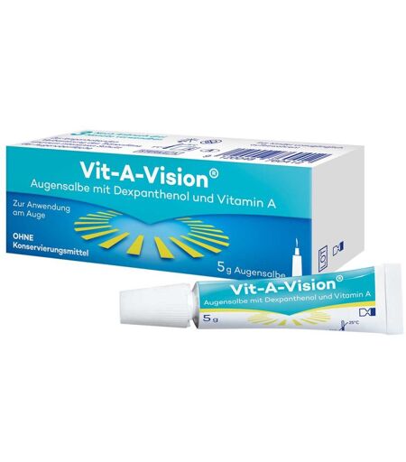 Anwendungsgebiet von Vit-a-vision AugensalbeVit-a-vision Augensalbe ist eine Augensalbe zur langanhaltenden Verbesserung des Tränenfilms. Viele Faktoren beeinflussen die Augenoberfläche. So können zum Beispiel trockene Augen, lange Bildschirmarbeitszeit sowie schädliche Umwelteinflüsse oder das Tragen von Kontaktlinsen dazu führen, dass die Augenoberfläche nicht mit ausreichend Tränenflüssigkeit benetzt oder der schützende Tränenfilm gestört wird. Zu typischen Symptome zählen Trockenheit, Reizungen, Brennen und Müdigkeit der Augen. Vit-a-vision Augensalbe dient zur langanhaltenden Linderung dieser Symptome. Die Augensalbe verfügt über Dexpanthenol und Vitamin A. Sie legt sich dank der hochviskosen Eigenschaften wie ein Film über die Augenoberfläche, stabilisiert den Tränenfilm und schützt das Auge vor Trockenheit. Die Vit-a-vision Augensalbe verteilt sich dank der sehr weichen und geschmeidigen Konsistenz sehr gut auf der Augenoberfläche. So können die Augenlider problemlos über die Augenoberfläche gleiten. Die Augensalbe ist besonders für die Anwendung über Nacht geeignet.Wirkungsweise von Vit-a-vision AugensalbeDie Vit-a-vision Augensalbe besitzt zellprotektive Eigenschaften, welche die normalen Regenerationsprozesse der Horn- und Bindehaut unterstützen, wenn diese durch Trockenheit beeinträchtigt sind. Das in Vit-a-vision Augensalbe enthaltene Dexpanthenol wird im Körper zu Pantothensäure umgewandelt und zählt zu den B-Vitaminen. Da es die Wasserbindungskapazität erhöht, bildet es dadurch einen schützenden Film auf der Augenoberfläche. Vitamin A unterstützt die Befeuchtung des Auges. Vit-a-vision Augensalbe ist phosphatfrei und enthält keine Konservierungsmittel.