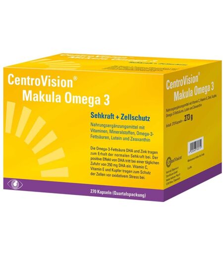 Omega-3-Fettsäuren sind Bausteine für die Gesunderhaltung des menschlichen Organismus. Als Bestandteil der Sehzellen und der Netzhaut haben sie speziell für die Sehkraft elementare Aufgaben. Sie müssen allerdings regelmäßig über die Nahrung aufgenommen werden, da der Körper sie nicht ohne weiteres selbst herstellen kann. Zur Erhaltung der normalen Sehkraft ist deshalb die Omega-3-Fettsäure Docosahexaensäure (DHA) sehr wichtig. Die positive Wirkung stellt sich bei 250 mg DHA ein. CentroVision® Makula Omega 3 ist somit eine wertvolle Quelle dieser essentiellen Omega-3-Fettsäure.
